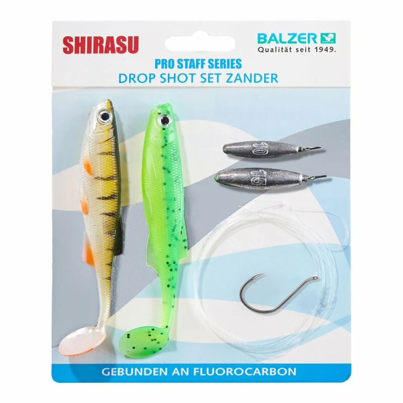 Fluorocarbon-Dropshot Rig 1,50m/0,35mm, Hakengr. 1/0, 2 x Dropshotblei: 10+15g, 2 x Shad2go Lemon Pepper und Hot Perch 10cm.